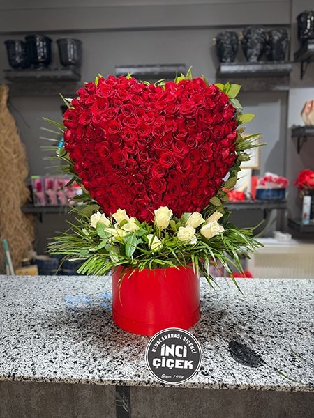 Aşkın ve tutkunun en güçlü sembolü olan kırmızı güller, kalp formunda özenle hazırlanmış bu özel aranjmanda buluşuyor. Beyaz güller ve yeşil yapraklarla çevrelenen tasarım, kırmızı silindir kutuda şık bir sunumla tamamlanıyor. Ankara çiçek gönderimlerinde romantizmi ve zarafeti ön plana çıkaran bu aranjman, Beytepe’de sevdiklerinize unutulmaz bir sürpriz yapmak için ideal. İnci Çiçek’in profesyonel işçiliğiyle hazırlanan bu tasarım, özel günlerde fark yaratır.