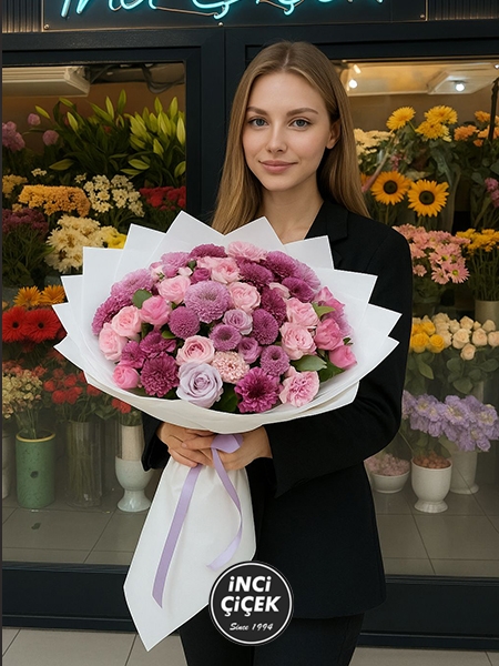 Lila ve pembenin büyüleyici uyumunu bir araya getiren Lila Pembe Zarafet Buketi, duygularınızı en zarif şekilde ifade etmenin en güzel yoludur. Yumuşak renk geçişleriyle hazırlanmış bu özel buket, ithal güller, krizantemler ve lisyantus çiçeklerinin göz alıcı kombinasyonuyla hazırlanmıştır.