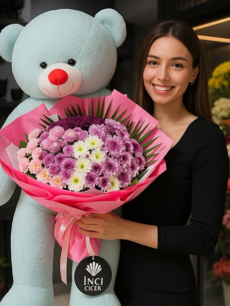 Pembe, beyaz ve mor tonlarında ithal krizantem ve güller
